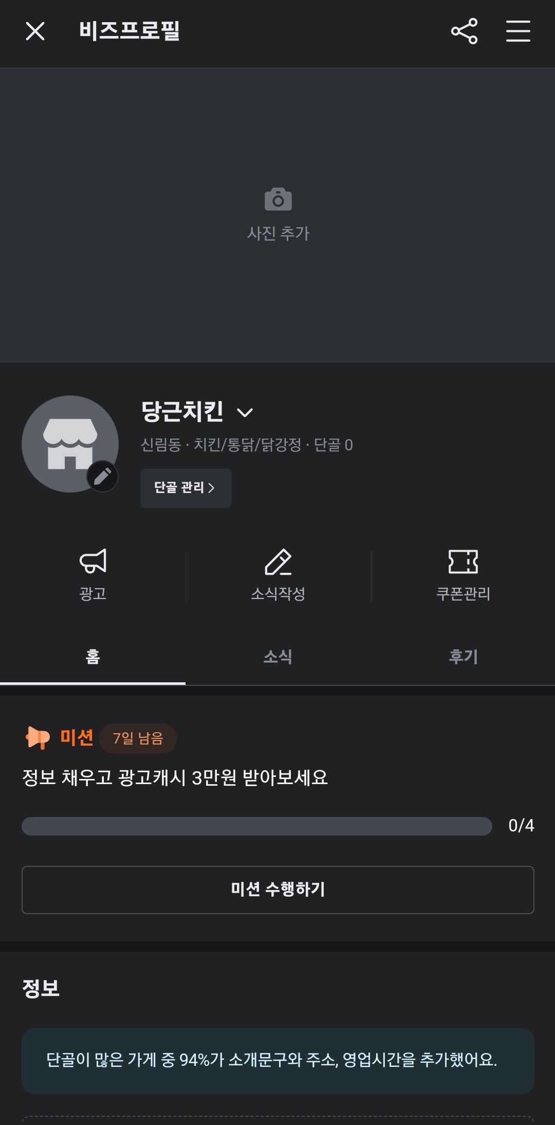완성된 비즈프로필입니다. 제가 임의로 만든 프로필로 당근치킨으로 만들었습니다. 사진 추가 부분에 프로필 사진이 입력됩니다.