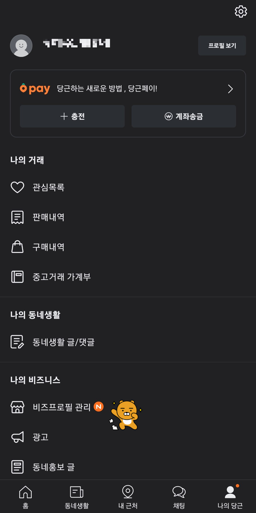 당근 마켓의 메뉴는 홈 / 동네생활 / 내 근처 / 채팅 / 나의 당근으로 이뤄져 있습니다. 이 중에 나의 당근이 다른 메뉴가 모여 있는 곳으로 비즈 프로필도 중간에서 확인이 가능합니다.