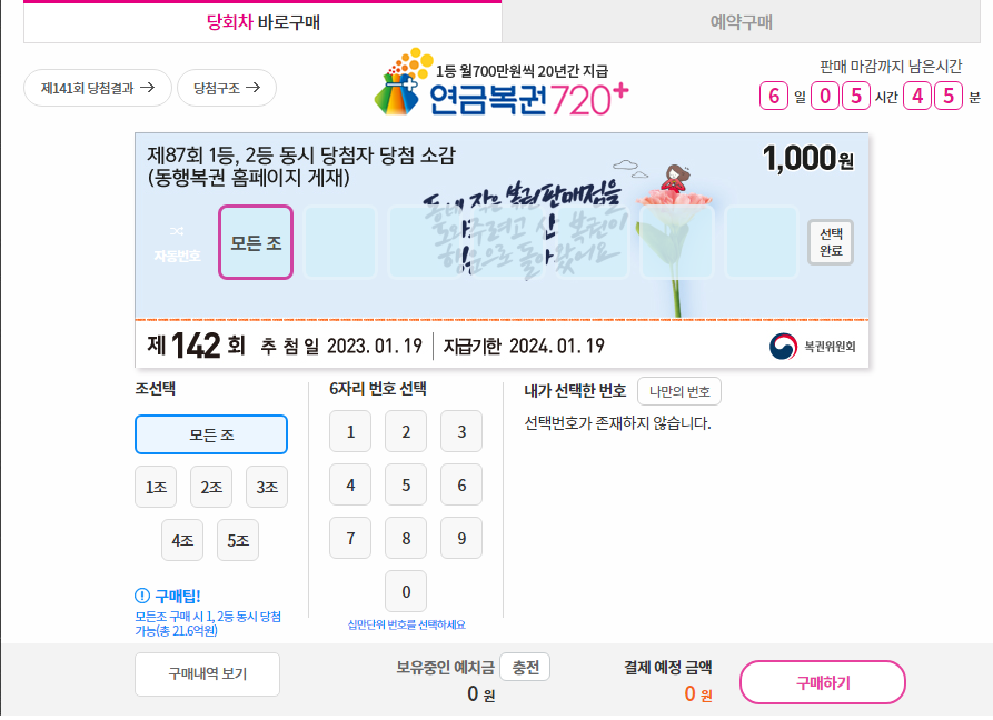 연금복권의 경우 당첨이 될 경우 6자리 번호는 모두 같고 모든 조를 구매해야지 1등, 2등의 동시 당첨이 가능합니다.