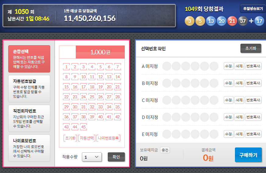 로또의 구매는 직접선택, 자동번호, 직전회차, 저장된 나의 번호로 구입할 수 있습니다. 일반 판매점과 동일하게 구입을 할 수 있습니다.