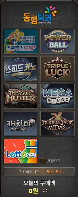 현재 홈페이지 내에서 구매할 수 있는 게임 종류입니다. 즉석 복권과 같은 게임도 같이 진행 중이며 하루에 진행할 수 있는 횟수의 제한 또는 금액에 제한이 있습니다.